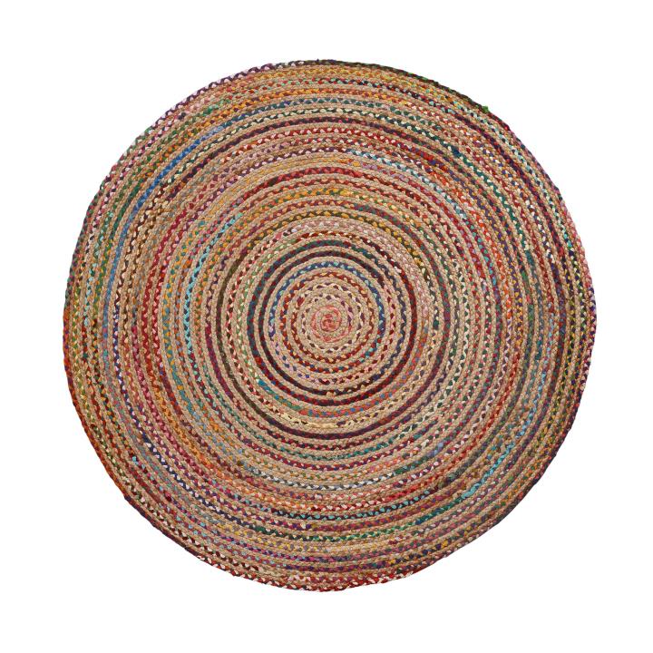 Round rug in natural jute with multicolor cotton combination.