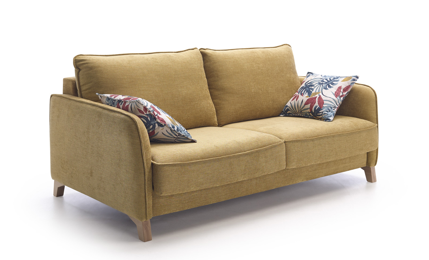 This sofa bed is practical and very easy to open and close. Thanks to its narrow armrests it is ideal for small spaces. Its 12 cm high legs (in wood or metal) allow cleaning with a robot hoover.