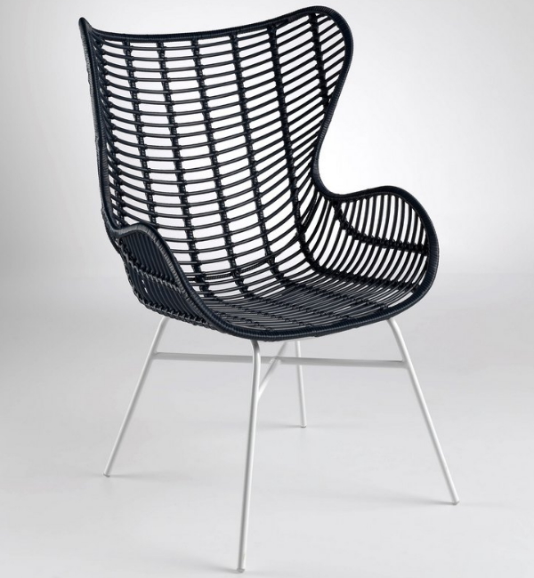 white painted metal and synthetic rattan in dark marine blue. Suitable for indoor and outside in a covered terrace or glass curtain area. 68x71x104cm height of the seat 40.