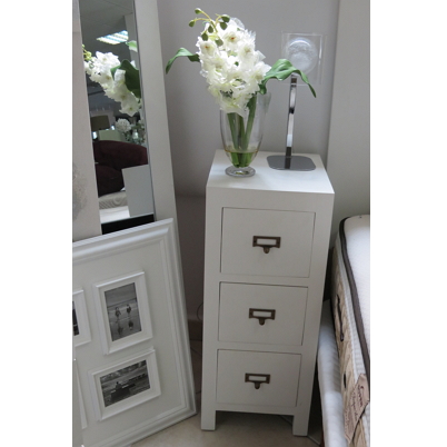 Slimline bedside unit painted white. metal handles.