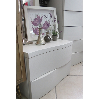 Solid wood white painted wave style bedside drawers. Italian made. 60cm wide x 45cm deep x 42cm high