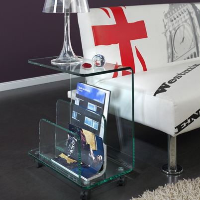 10mm tempered glass magazinbe rack/side table on wheels. 50 x 28 x 54cm