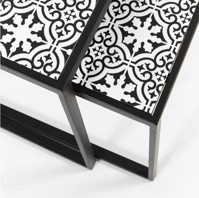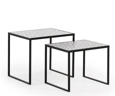 Black metal and MDF inlay with a pattern. Larger table 45x55x43cm smaller table 38x50x40cm