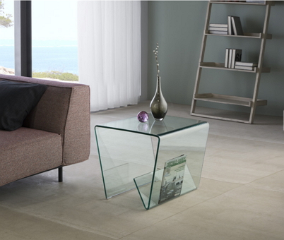 12mm curved clear glass side table with lower magazine rack. 50x50x50cm matching glass coffee table also available.