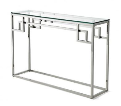Stainless steel legs in colour silver. 10mm tempered glass. 115x30x78 cm part of the "steels" collection
