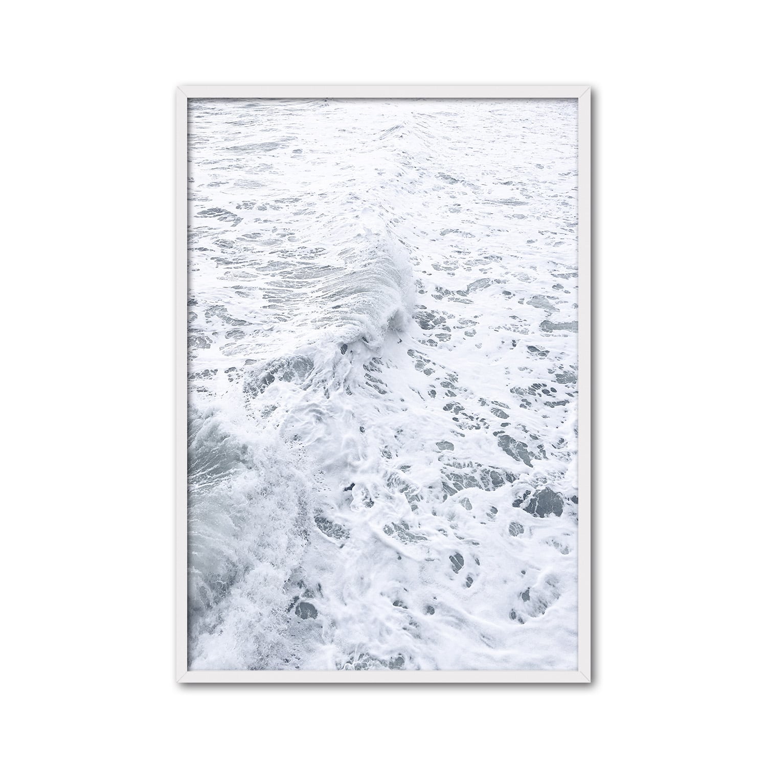 Sea painting. Photography by Elizabeth Lies framed in white frame plus glass. Image of a rough sea and waves in white and bluish gray tones.