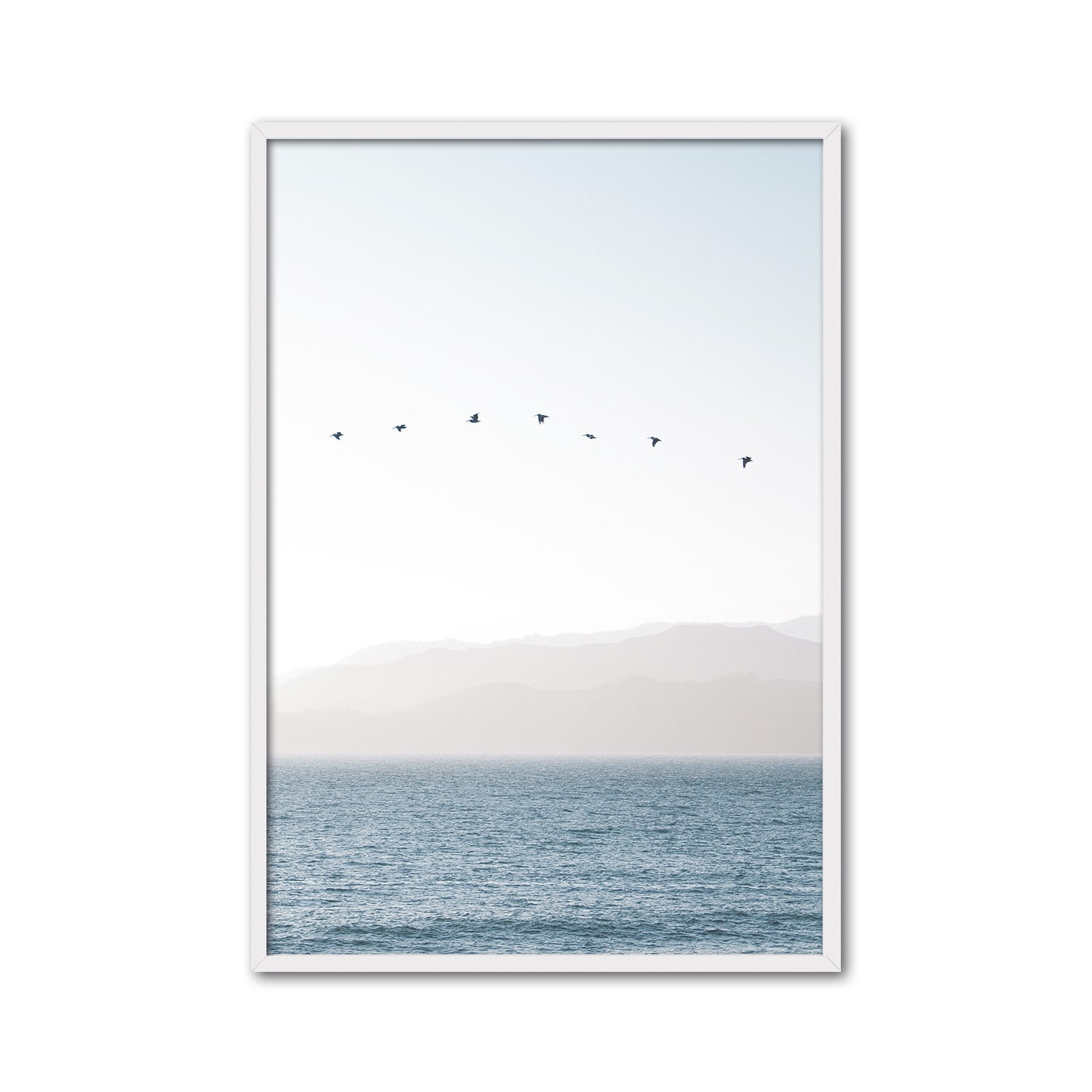 Beautiful view of the sea and the horizon with the distant flight of seagulls. Image in light blue and white tones ideal for bright spaces. We propose this painting framed with white molding plus glass, although if you prefer another finish, contact us.