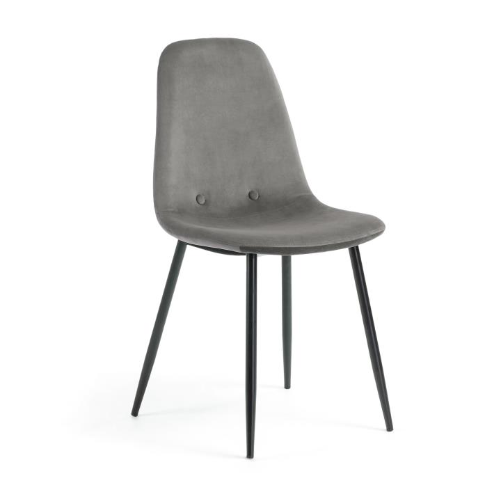 Chair upholstered in grey velvet fabric. Matt black powder coated steel legs.