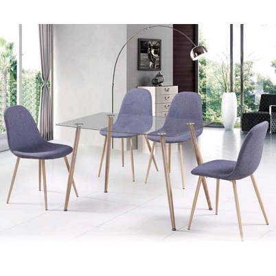 Transparent glass topped table in 8mm glass. Metal legs with a wood look painted finish. 120x75 high x70 wide