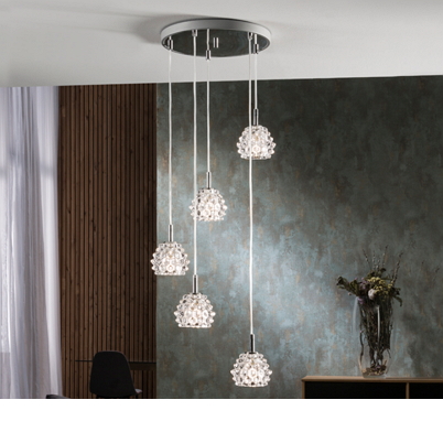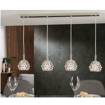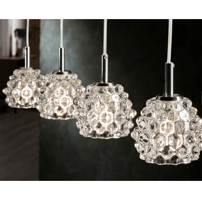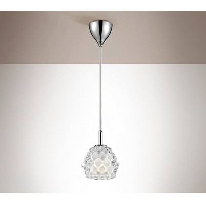 Metal and chrome light with clear glass pressed shade. Available in single pendants, wall lights and fixed ceiling light with four lights.
