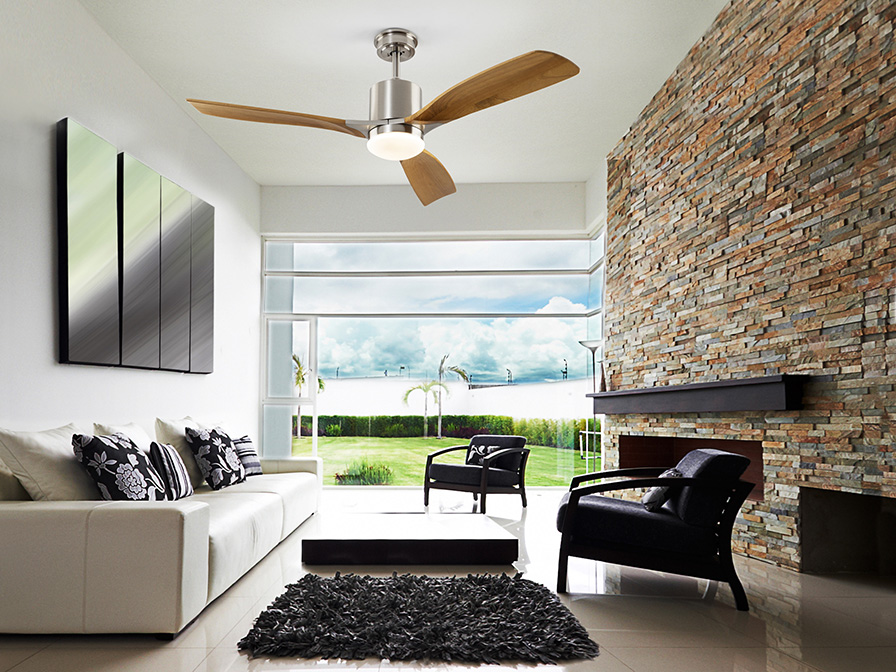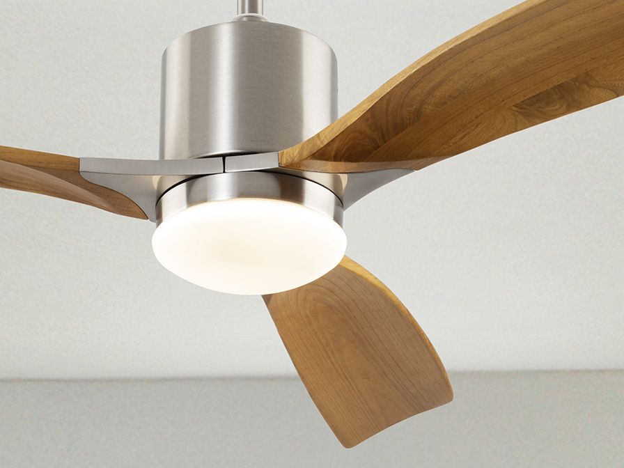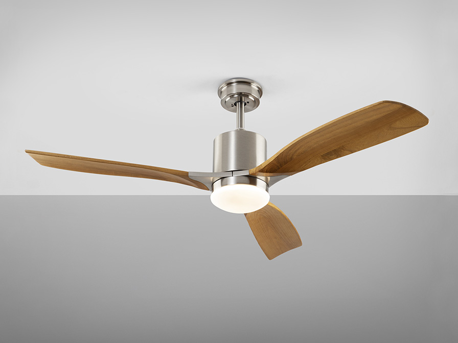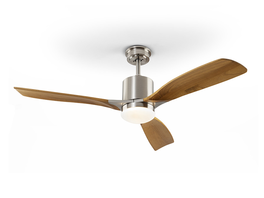 Ceiling fan with LED light. Made of metal, satin nickel finish and blades in wood, cherry finish. Opal glass diffuser. 6-speed inverter DC motor fan. CCT LED of 3 colour temperature tonalities. Timer. Anti-rocking mounting system.