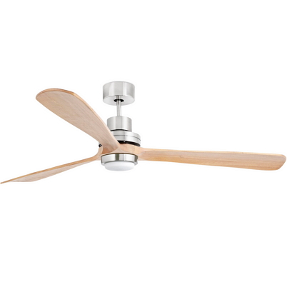 Modern ceiling fan with LED 3000k light. Matt nickel and pine. Also available in brown. Natural Wooden blades steel motor and opal glass difuser. Remote controlled, with 3 speeds. Can be used in reverse action in winter. Installation on inclining roof also possible. 1680 mm diametre. 410 mm high.