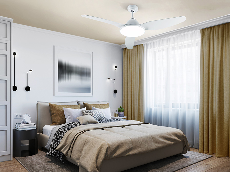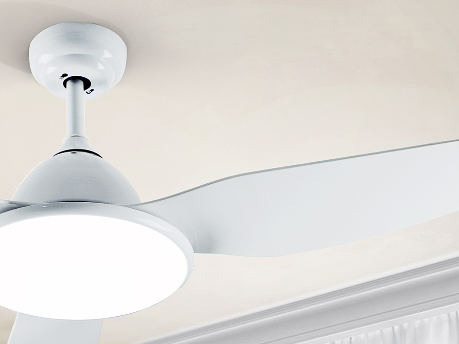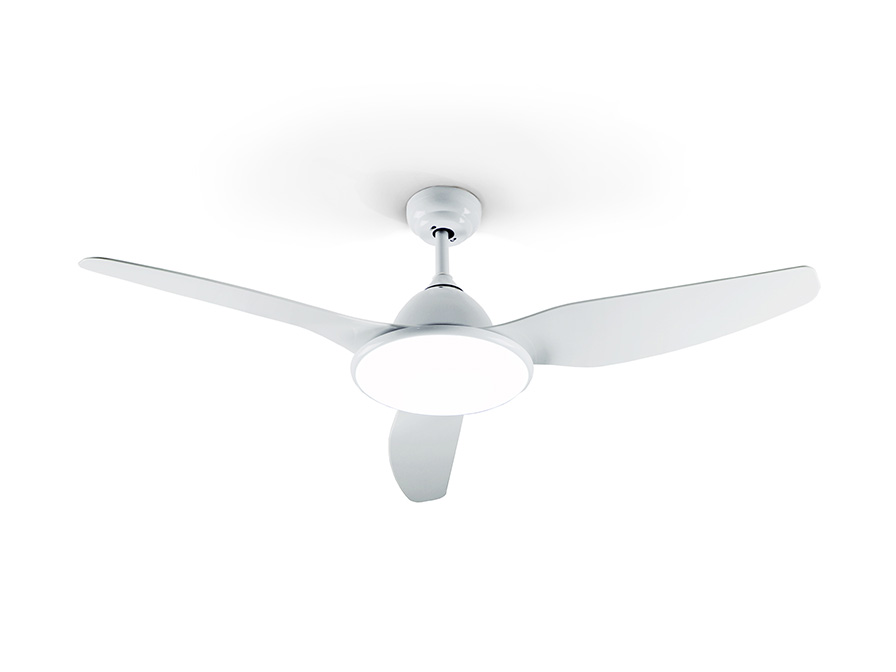 Celing fan with LED light. Made of metal and blades in plastic, white finish. Opal acrylic diffuser. Fan with 6-speed reversing DC motor. CCT LED of 3 colour temperature tonalities. Timer. Anti-rocking mounting system.
