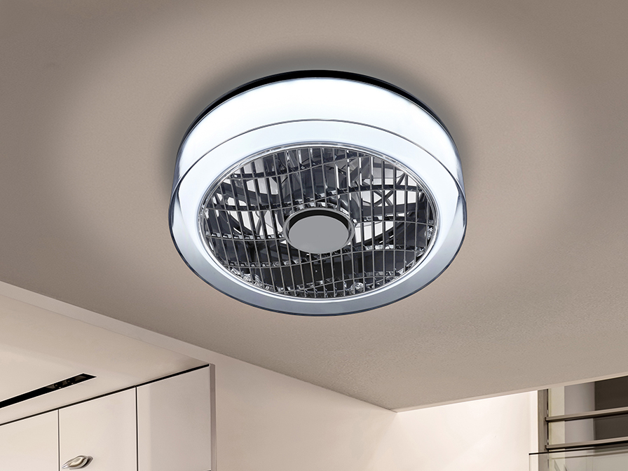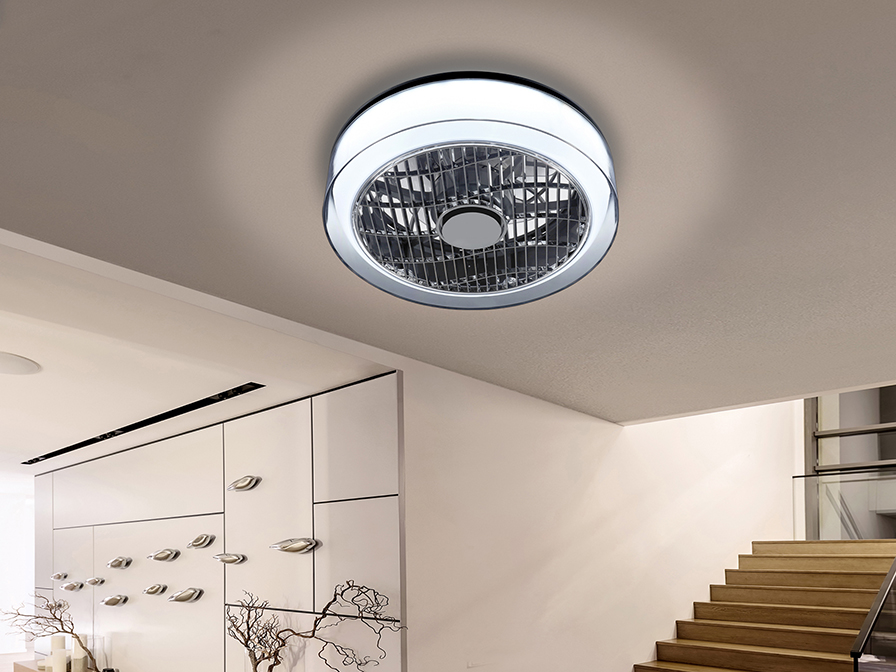 LED ceiling fan with three speeds and change of direction. Adjustable light (intensity and colour temperature). Made of metal and acrylic, finished in chrome-smoke. Polycarbonate opal diffuser with external clear ring.