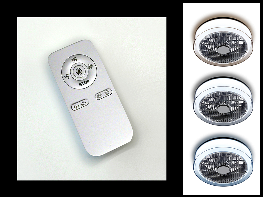 Remote control and Smartphone APP by Bluetooth included. 24W LED, 1.920 lm, 3.000-6000 K. Fan: 5-blade, Ø25 cm. Diffuser grille: swivel/reversible, Ø30 cm. Action ratius: Ø150 cm (measured 140 cm underneath the fan) Noise emission according to speed: Lower 41db/middle 43 db/high 47 db.