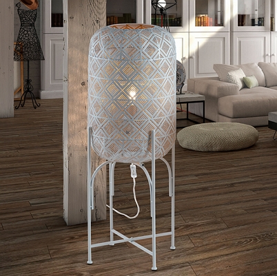 Punched metal large lantern on stand. Matt white exterior with gold interior. Dimmable.98cm x 39cm