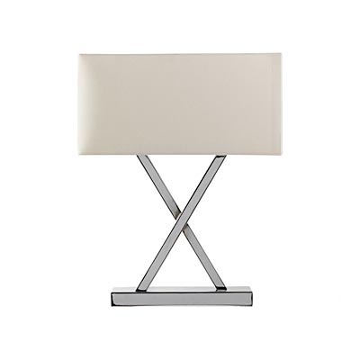 Enigmatic table lamp featuring an unmistakable design in the form of an "X". Chromed iron with polycotton shade. 40cm x 50cm x 20cm. Large standard floor lamp also available to match - 60cm x 157cm x20cm