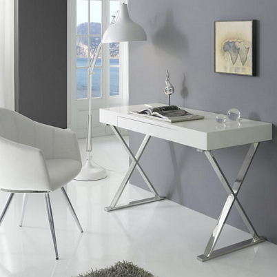 white laquered high gloss white desk with single drawer. Ideal as a modern dressing table too. stainless steel chrome legs. 120x55x76cm