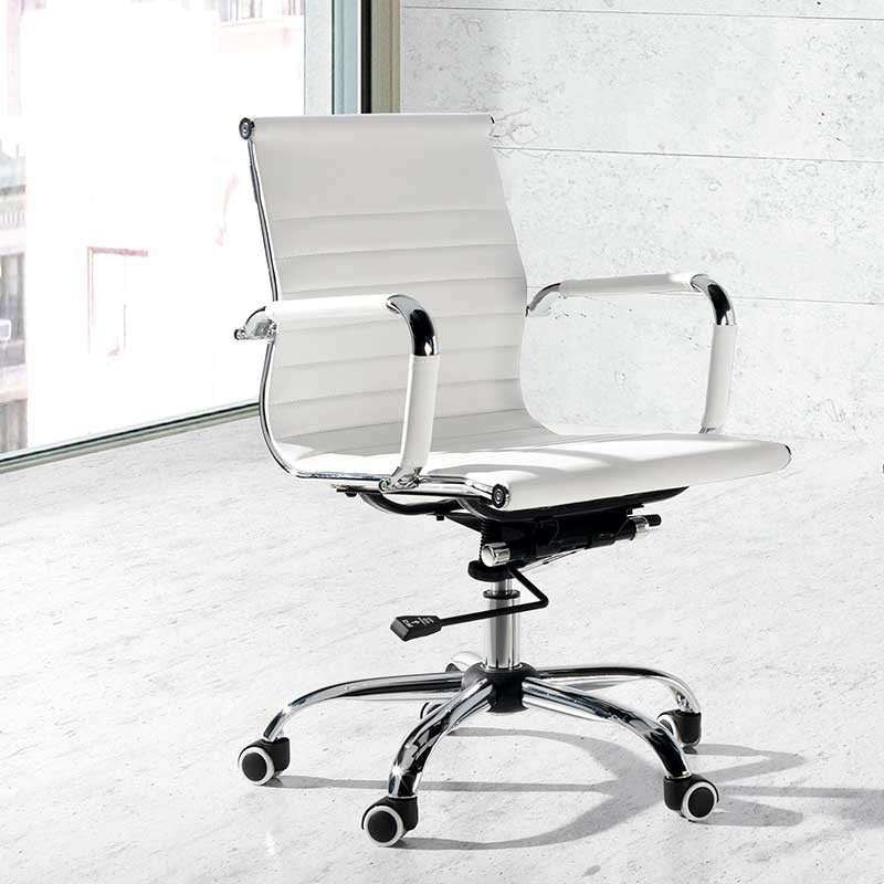 Executive model 75570 office chair with seat upholstered in white synthetic leather and metallic structure with armrests and legs in polished chrome.