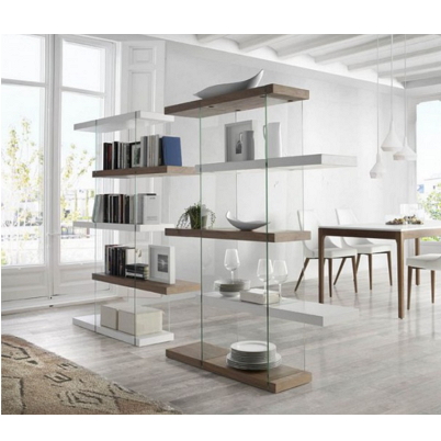 Modern and stylish white and walnut effect shelving unit with two glass panels. 130x30x165 high. Available in 3 white and 2 walnut shelf combination or 3 walnut and 2 white shelves. Ideal against the wall or as a divider as pictured.
