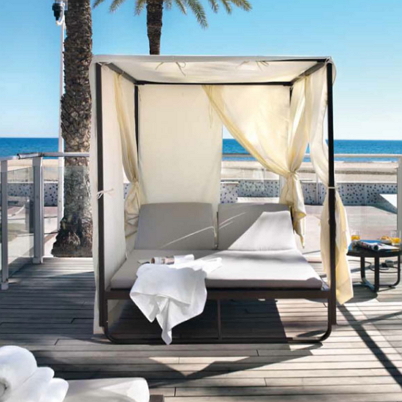 Stylish and modern double sunbed in frame with curtains and sun shade.