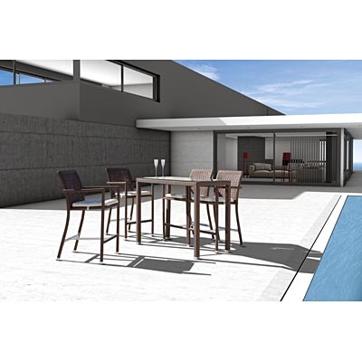 Terrace and outdoor bar stool chairs and table. In aluminium and chocolate brown synthetic woven rattan. Table is 107cm high and 135cm x 70cm wide. Each chair is 120cm high. Can be purchased individually or as a set.
