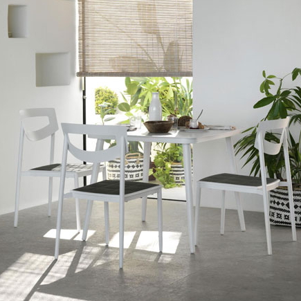 White aluminium modern dining set designed for outdoor or indoor use. Two tables available in square 90x90 and rectangular 160x90 with armchairs or simple dining chairs
