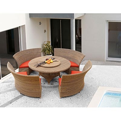 Striking and luxurious eight place circular outdoor dining set with cushions and spectacular curved bench seats. Table also available with lazy susan as an optional extra. In beautiful natural colour synthetic rattal and aluminium structure. Each chair is 173cm wide and the table is 170cm in diametre... plenty of room for entertaining.