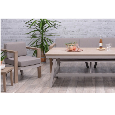 Resin and aluminium set resistant to UV rays. Waterproof covers in brown 12cm thick. Scatter cushions in white. Set consists of 1x 3 place corner sofa module 212x85x47/68 sofa module 3 place 210x85x47/68 to make an L shape corner suite. 1 chair 71x76.5x47/68cm and centre table 165x98x68