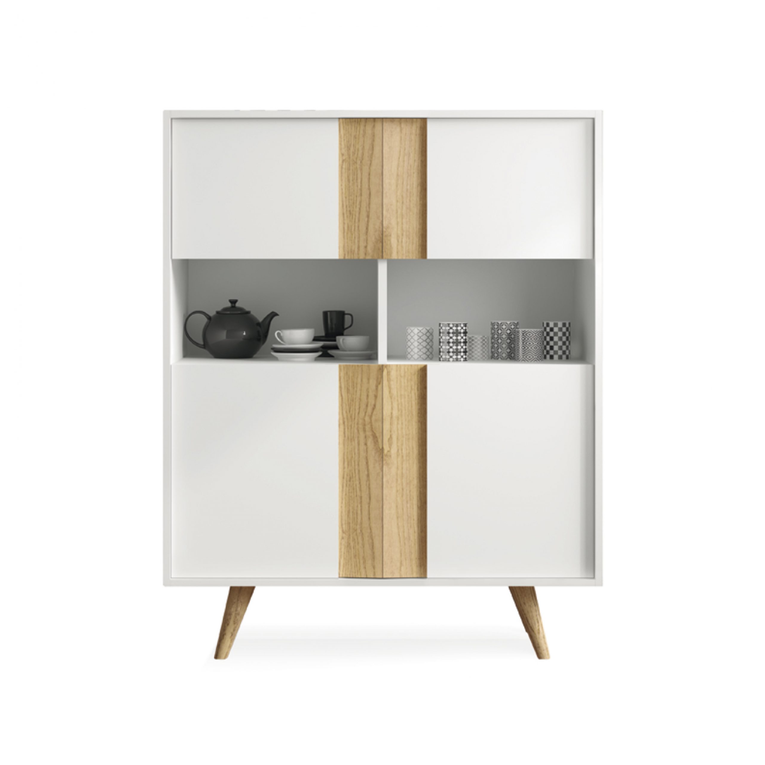 White lacquered cube cabinet with natural wood combo and conical wooden legs.