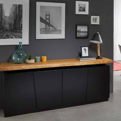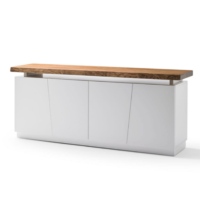 Sideboard in lacquered white or black. Matt Finish. 190 x 47 x 80 cm with four cupboard doors with automatic push. Doors with slanted design. Floating top in solid wood and available in three different colour finishes. Other matching pieces also available.
