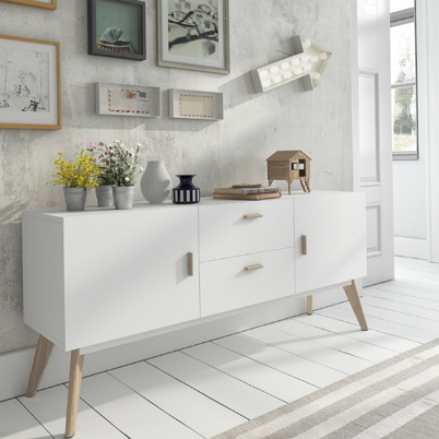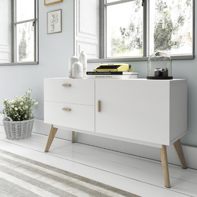 Lacquered white sideboard with one cupboard two drawers. Combination with oak. Available in two sizes 120 x 40 x 70 cm and 160 x 40 x 70cm with two cupboards and two drawers.
