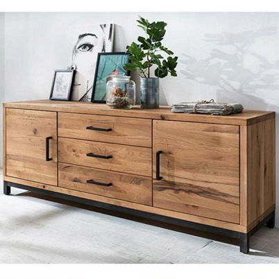 Oak two door and three drawer side board with metal plinth legs. 180x50x77